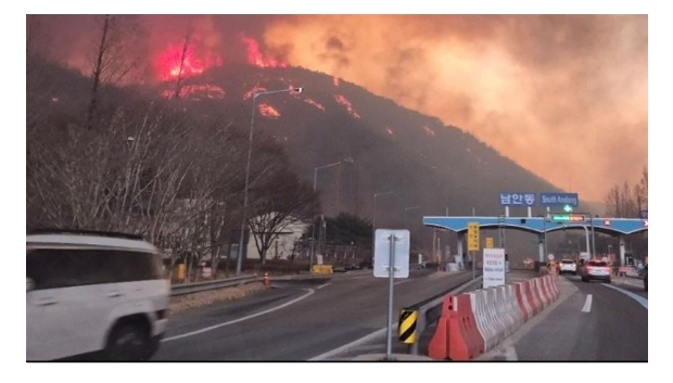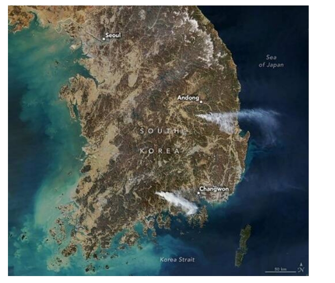 據美國當地時間3月25日一篇附有NASA衛星照片,報導「韓國全境爆發山火」衛星影像顯示:「其中一股濃煙柱從義城郡安東(Andong)附近的野火地區竄升」,並指出,「在南部的山清郡(Sancheong),另一股巨大的濃煙柱正在升起。」整個南韓上空瀰漫著濃厚的煙霧,災情嚴重程度可見一斑。