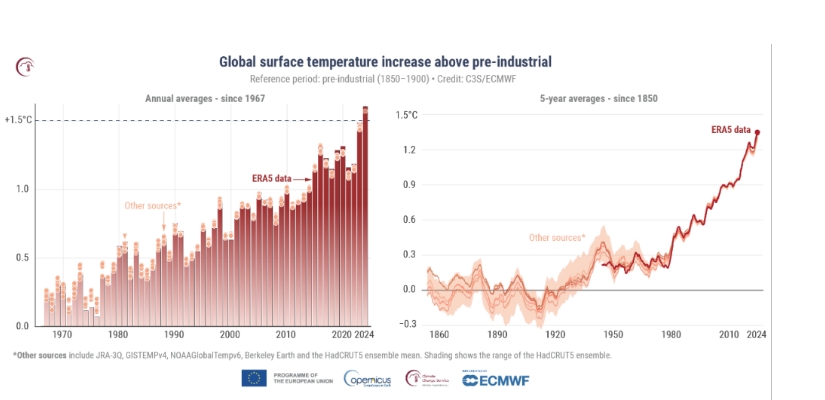 2025年2月17日世界氣象組織根據6個國際研究單位之數據,確認2024年全球年均溫比1850~1900年工業化前的平均值高出約1.55 °C(± 0.13 °C),創下新高,並宣告為有記錄以來最熱的一年,且過去10年(2015~2024)都列入最熱前十名。2024年經損規模達數十億美元的天災事件即創下21起新高記錄,其中美國遭受颶風海倫和米爾頓各約200億美元以上損失,成為本世紀最高的氣候災難事件。2025年3月2~3日中國冰火兩重天,山東降暴雪,南方氣溫急劇飆升30℃以上。2025年3月14日強烈龍捲風席捲美國中部,在奧克拉荷馬、密蘇里和佛州等地造成滿目瘡痍,至少16人罹難,還有數十人受傷。3月16日綜合美聯社與法新社報導,24場龍捲風和猛烈風暴肆虐美國中部,遍布密蘇里、阿肯色、密西西比與伊利諾伊等州。2025年3月中旬美國南北冰火兩重天,風暴規模與強度更屬異常。