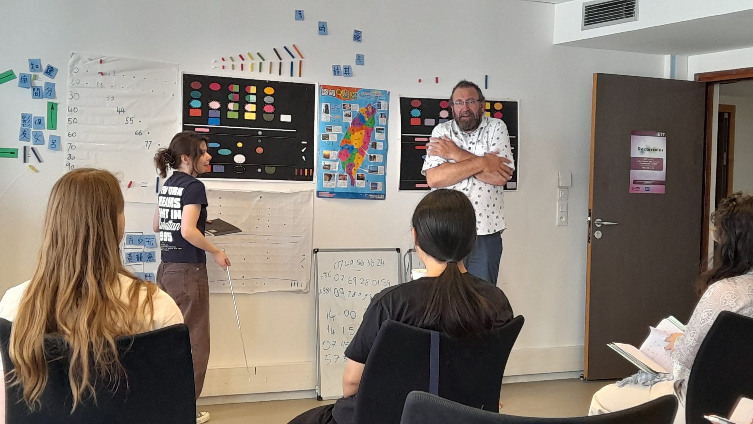 法國學員先學著用台語從一數到十,藉此習慣台語多樣的聲調,接著藉由兩位數數字學習台語變調。學生也藉由台語電話號碼了解台語文白音。阿友老師也會教學生台灣、法國及台灣地名的台語唸法,學員因此了解「台灣」的中文跟台語發音原來不同。藉由學習國家與地名,學員從台語單字到好幾個字,逐漸習慣台語變調。即使學員有時候卡住,阿友老師總會耐心引導。
