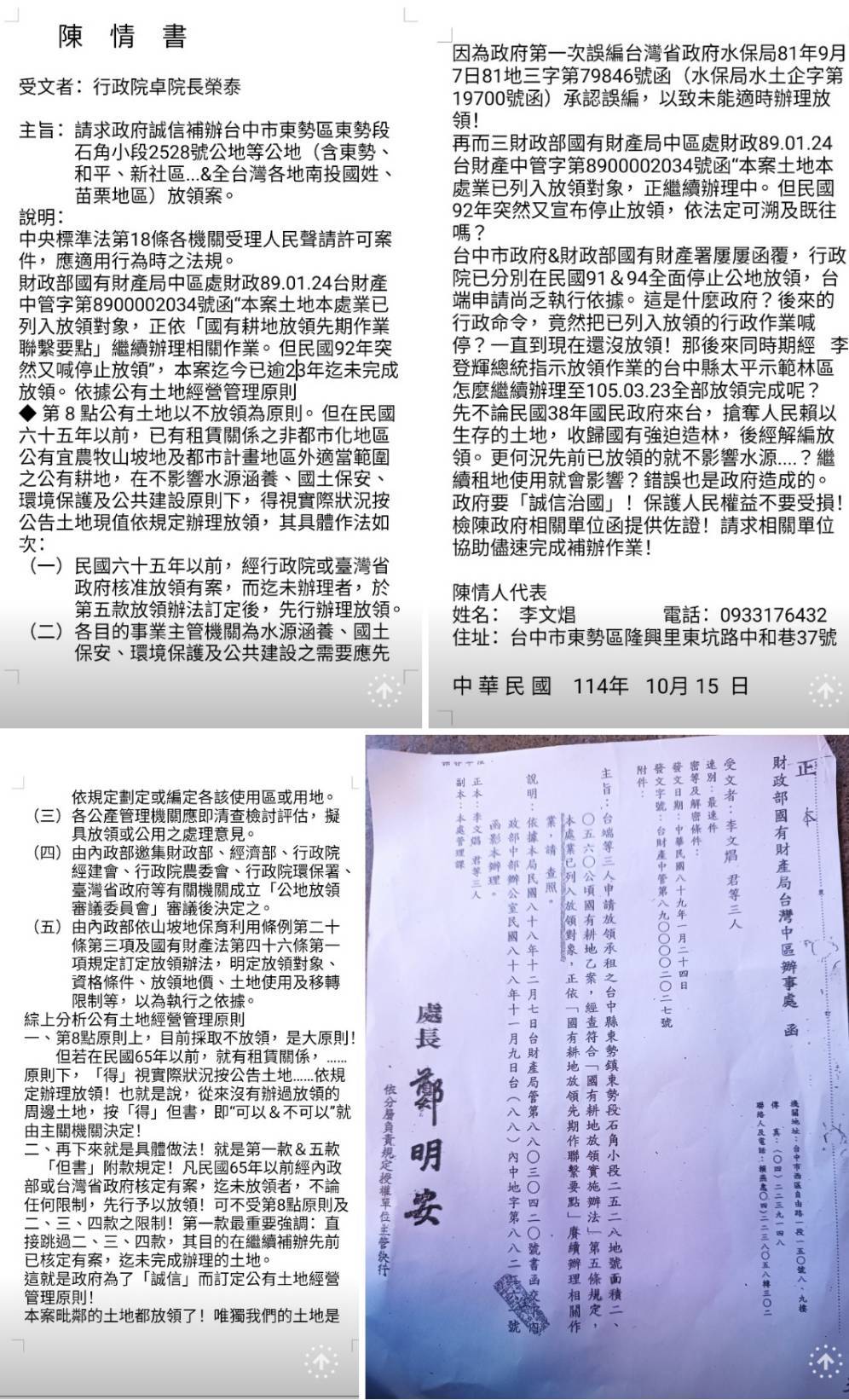 呼籲行政院卓榮泰院長與內政部劉世芳部長,能秉持誠信與公正,重新啟動公地放領審查程序,讓政策回歸法治與公平的軌道,還土地於民、還正義於民。