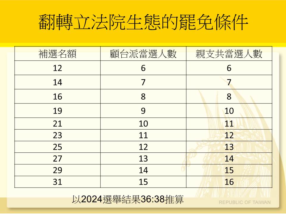 根據附圖,在31個等待被罷免的親支共立委中間,咱台灣人著愛:成功罷免12個,才會當補6個顧台灣的立委;成功罷免16個,才會當補8個。