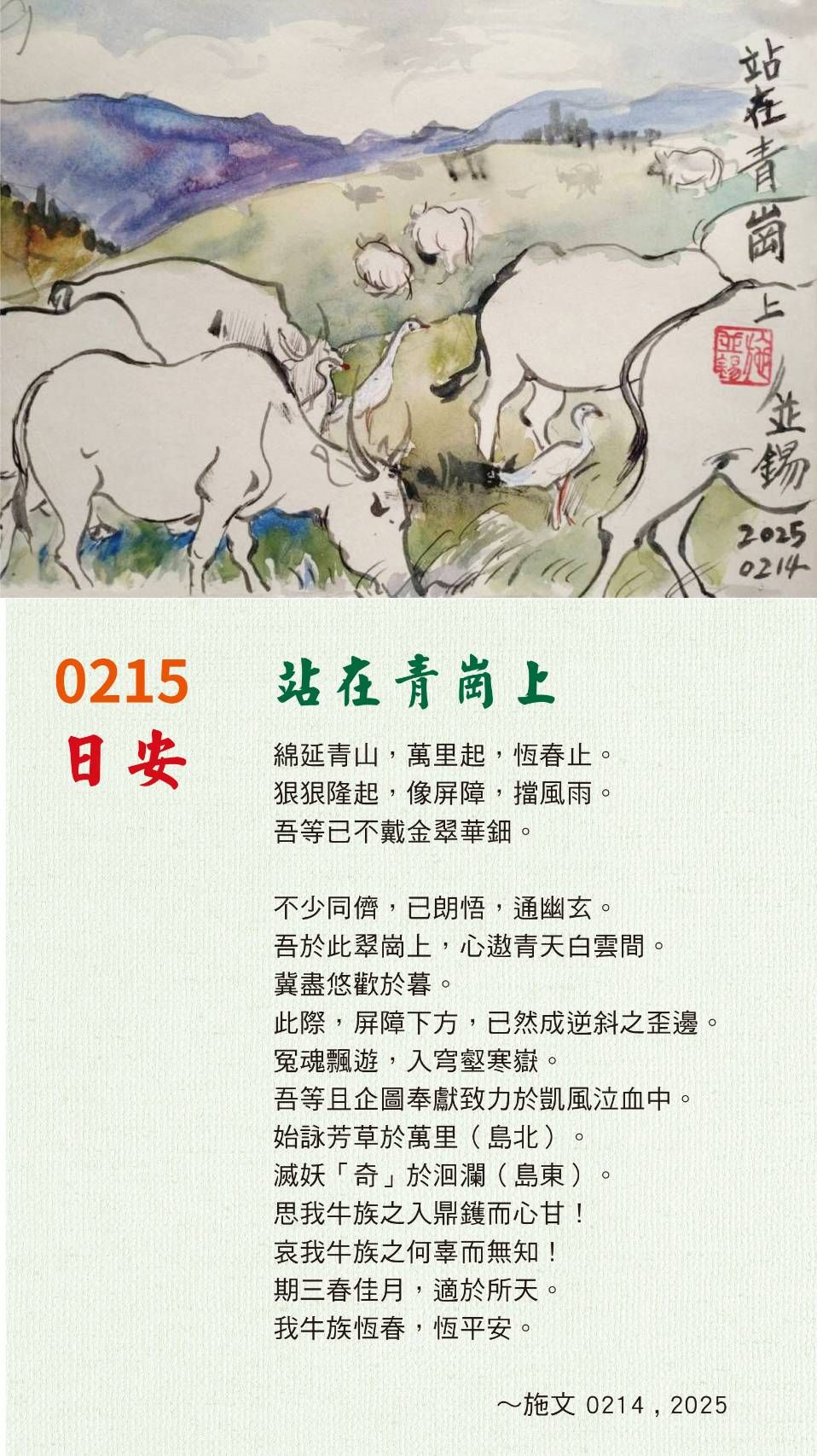 現在趨勢 〈美國觀察〉伊朗戰爭對世局的影響( 之六)川普總統策略成功,伊朗接受美國六大條件 公督盟表揚優秀立委 台灣教師聯盟感謝教育立委共同捍衛國家制度 讓台灣教育持續前進 日本政黨倡議「台灣交流發展法」盼為日台交流建立穩定、官方互動機制法制化邁出關鍵一步 【專欄】以色列轟炸伊朗?IMF下修全球成長 「鹹甜引路臺南味」物超所值,平價行銷,「佳湘麵包烘焙」大通膨時代下的幸福存在 家專欄 〈漫畫集〉施並錫時事批判 分享 FacebookXPinterestWhatsApp By: 施並錫 Date: 2025-02-15 本文僅代表作者立場,不代表本平台立場 相關 分享文章Facebook Comments 文章留言 施並錫出生於彰化鹿港,畢業於師大美術系、紐約大學藝研所,曾任中華民國油畫協會監事、臺灣師範大學美術學系教授、高雄縣文化局局長等職。在學界、藝術界頗為活躍。對藝術工作的許諾是:畫遍臺灣的人、事、物,並從中發現純樸的真、善、美。 你可能還感興趣的新聞 主編精選 〈專文〉昔日敵人,今日戰友 台灣專欄 台灣達人【科技島之魂】– IC封裝的矽品林文伯 AI 海委會建構「國家級海洋雷達觀測網」 AI賦能守護海域安全與決策支援能力 保健 高雄市今年第三例境外移入登革熱病例現蹤 赴馬爾地夫旅遊返國確診 主編精選 〈美國觀察〉伊朗戰爭對世局的影響( 之五) 川普掌控全局 勝利在望 健康專欄 高市公私協力智慧防疫 TOCC問卷系統抽獎活動今表揚推廣績優診所 健康 貝里斯教育部次長率團訪義守大學 「醫學無國界」深化醫療合作 台灣 為什麼越來越多年輕人選擇兼職斜槓? 主編精選 【專欄】五十三年來,首次載人繞月任務成功 專欄 兩岸博弈與在地生存 : 金門的機遇與無奈 主編精選 【專文】從婚姻看高市早苗的良善 推薦閱讀 專欄 【專欄】法律與財務最重要! 專欄 【專欄】政治掛帥是人民幣國際化的攔路虎 台灣 〈專文〉藍白扼殺救濟管道 蕭明岳無從申冤 主編精選 【專欄】川普撤回巴黎協定,美中清潔能源競爭仍持續 裝載更多