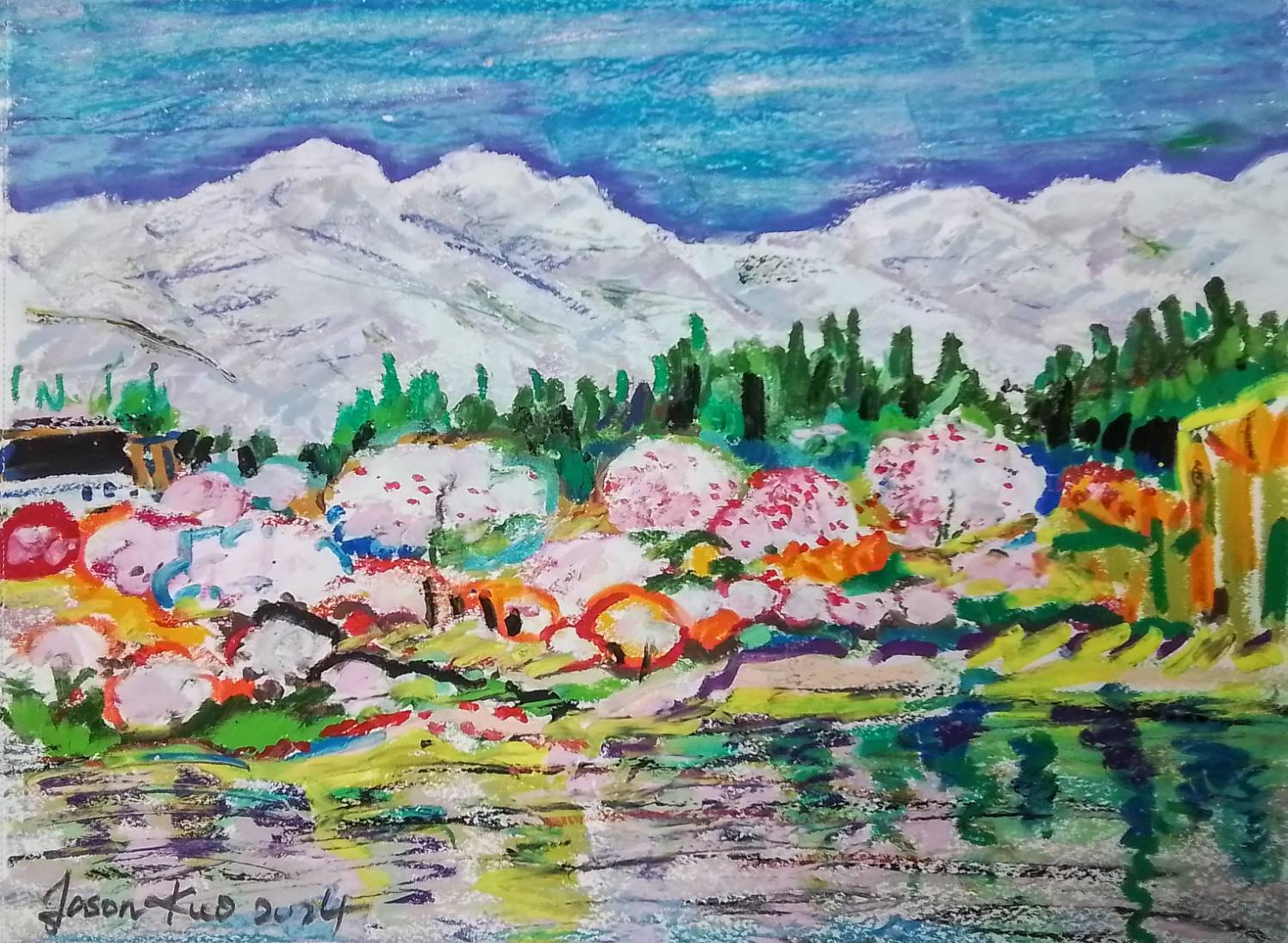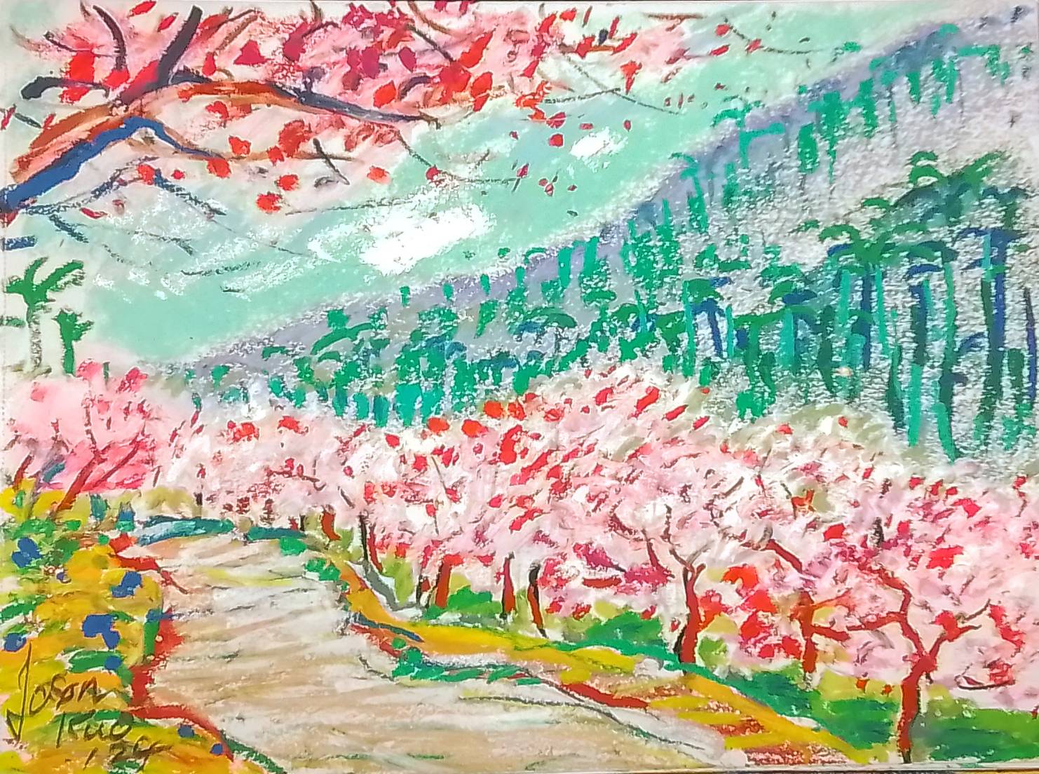 2024元旦伊始,我以輕鬆的心情,每日抽出短暫的時刻,隨手畫一些小品油性粉彩,二三十天竟有三十幾張之量。接著春入三月,花漫人間,筆下的櫻花燦爛,落英繽紛,宛如一場人老暮雲,花事憧忡的況味。遂分享於幾位老友,竟獲讚嘆之聲,頗感意外。