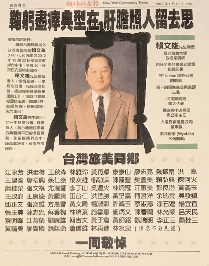 只是沒多久後,賴文雄積極協助許信良辦美麗島週報;許信良要「遷黨回台」時,賴文雄更是他的頭號粉絲兼財務大臣;黑名單解禁後,許信良擔任民進黨主席時投桃報李,在1991年提名賴文雄為第二屆僑選國大代表,此後賴文雄即一直留在故鄉台中,於2012年12月22日病逝。