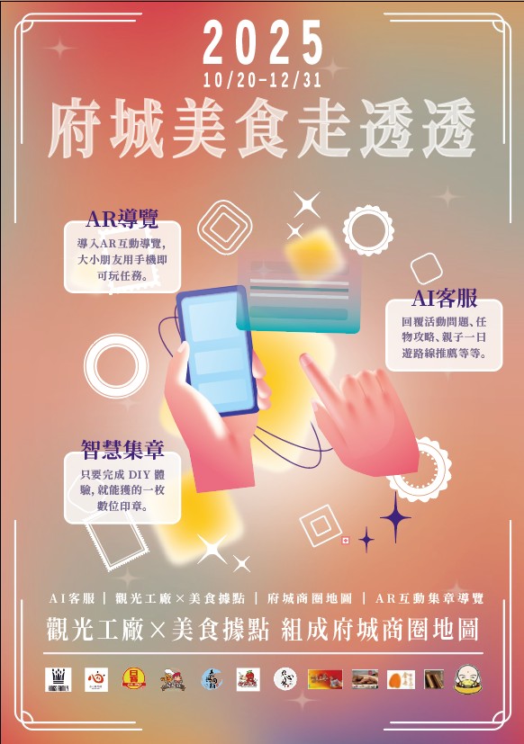 由政府支持、台南在地店家與AI食旅團隊共同籌畫《府城美食走透透》活動將於10月20日正式啟動,活動結合AR擴增實境與AI導覽系統,讓旅客只要掃描手機就能體驗導覽、完成任務、集章抽獎、領取優惠,打造全新的智慧旅遊體驗。團隊強調,本次招募不限業種,凡設於台南地區的餐飲、甜點、伴手禮、文創品牌、旅宿及特色商家,都可免費參與導覽地圖與宣傳推廣,名額有限。