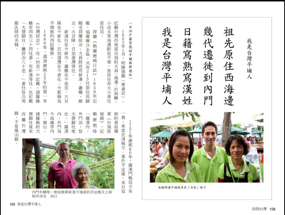 〈我是台灣平埔人〉:「祖先原住西海邊,幾代遷徙到內門;日籍寫熟寫漢姓,我是台灣平埔人。」是寫原居住古臺江海邊的西拉雅族新港社,後來遷徙到內門,是平埔族從平地遷徙內山史料最清楚明確的歷史。這首詩是以詩寫史、以詩證史,最有平埔原住民身分證據力的一首詩。