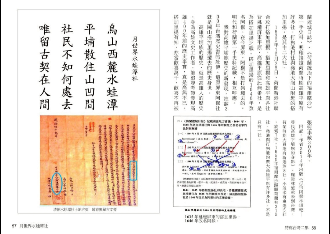 〈月世界水蛙潭社〉:「烏山西麓水蛙潭,平埔散住山凹間;社民不知何處去,唯留古契在人間。」是寫清代居住高雄月世界的水蛙潭社,說明很多平埔社番是因立契約典賣土地而遷離原居地。