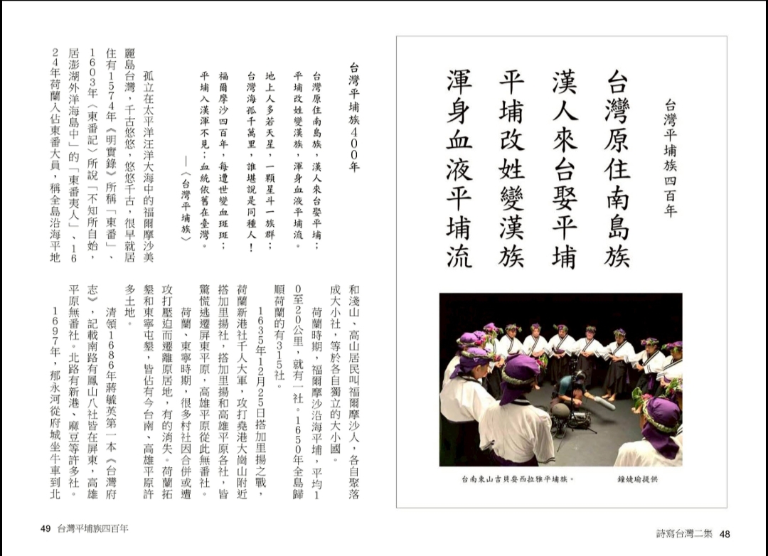 〈台灣平埔族四百年〉:「台灣原住南島族,漢人來台娶平埔;平埔改姓變漢族,渾身血液平埔流。」「地上人多若天星,一顆星斗一族群;台灣海孤千萬里,誰堪說是同種人。」「福爾摩沙四百年,每遭世變血斑斑;平埔入漢渾不見,血統依舊在台灣。」這三首是寫台灣平埔族400年來被不同外來族群打壓,和與漢人通婚、融合、遷徙,改漢姓漢化,從沿海平埔消失的歷史。此三詩並以最精短的1000多字考證文和圖片,來寫台灣平埔族400年的歷史故事,是清代就世居臺灣的福佬客家人,可說都有平埔血統,比例不同而已。。