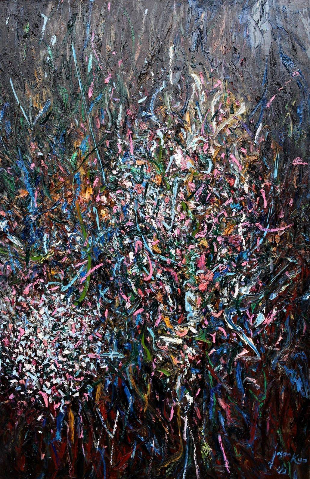 因而,以直覺的眼光,直視此畫一大片黑色背景上的五花八門之點、線、面奔流,微觀之,這是爆炸式的視覺衝擊;巨觀之,這是夜空中的煙火點點燦爛似花,流星紛紛墜落如雨。