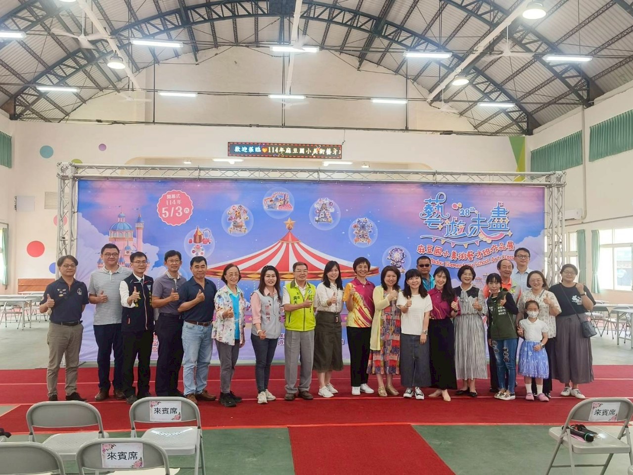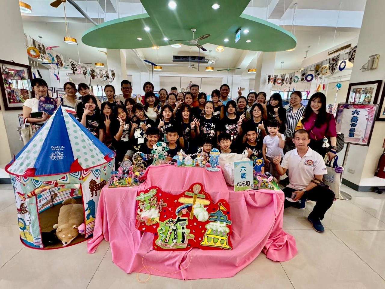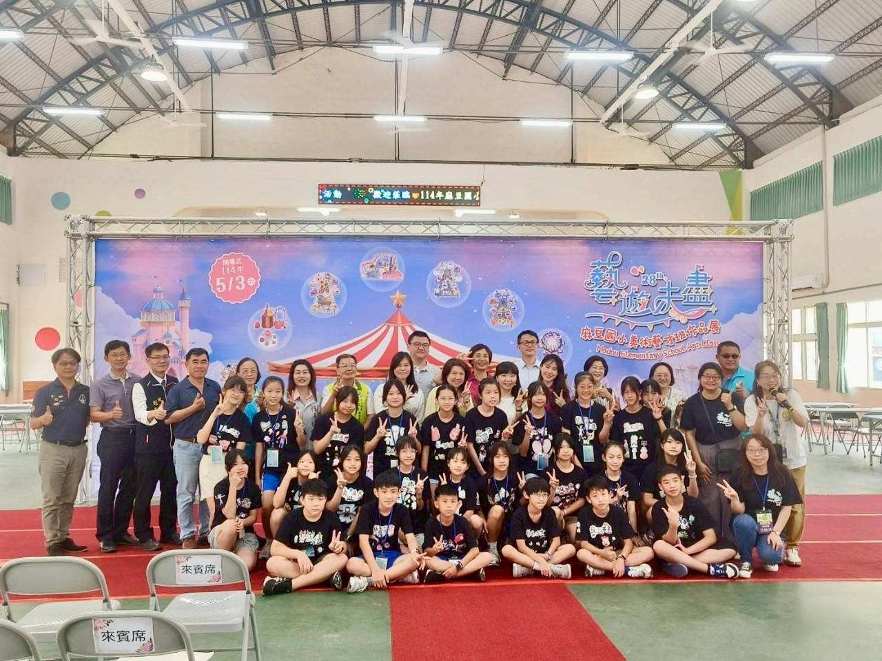 麻豆國小李貞儀校長表示,本次以「遊樂園」為主題的展覽,融合美術與科技,由 28 屆畢業班學生創作的各式作品,包括黏土與3D筆製作的立體遊園地圖、與麻中科技中心合作設計的摩天輪、縫製的襪子娃娃,以及T恤轉印設計等。其中最吸睛的是大型拼布集體創作,彷彿色彩斑斕的童話畫卷,呈現藝遊未盡之感。展區亦展出如「表演高手」水墨畫、自創LINE貼圖、公仔及「貓的狂想曲」版畫等,充分展現學生們的創意與想像力。