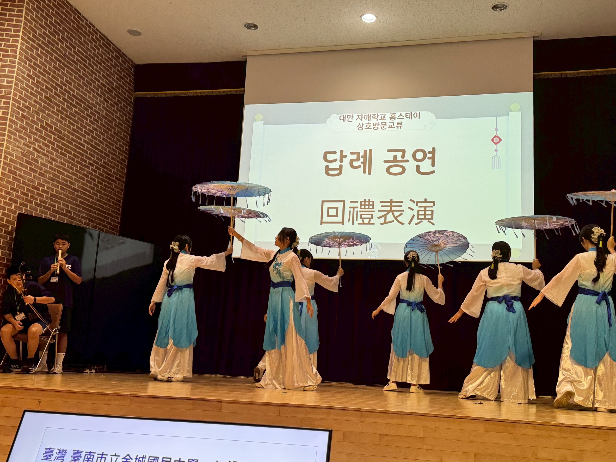 在交流開幕的歡迎會上,九份子學生特別準備一段極具文化美感的表演節目《傘舞青花.弦笛共鳴》,以二胡及直笛演奏周杰倫〈青花瓷〉作為音樂背景,搭配優雅的紙傘舞演出中國古典舞蹈,展現東方藝術之美。學生們身著傳統風格服飾,舞姿婀娜、韻味十足,贏得現場韓國師生如雷掌聲,也讓臺灣文化在異地閃耀。偕同帶隊的家長會長王俊憲說:「讓孩子踏出國門,是培養世界觀的最好方式。我們期待每位孩子都能在旅途中有所成長,帶回屬於自己的精彩故事!」