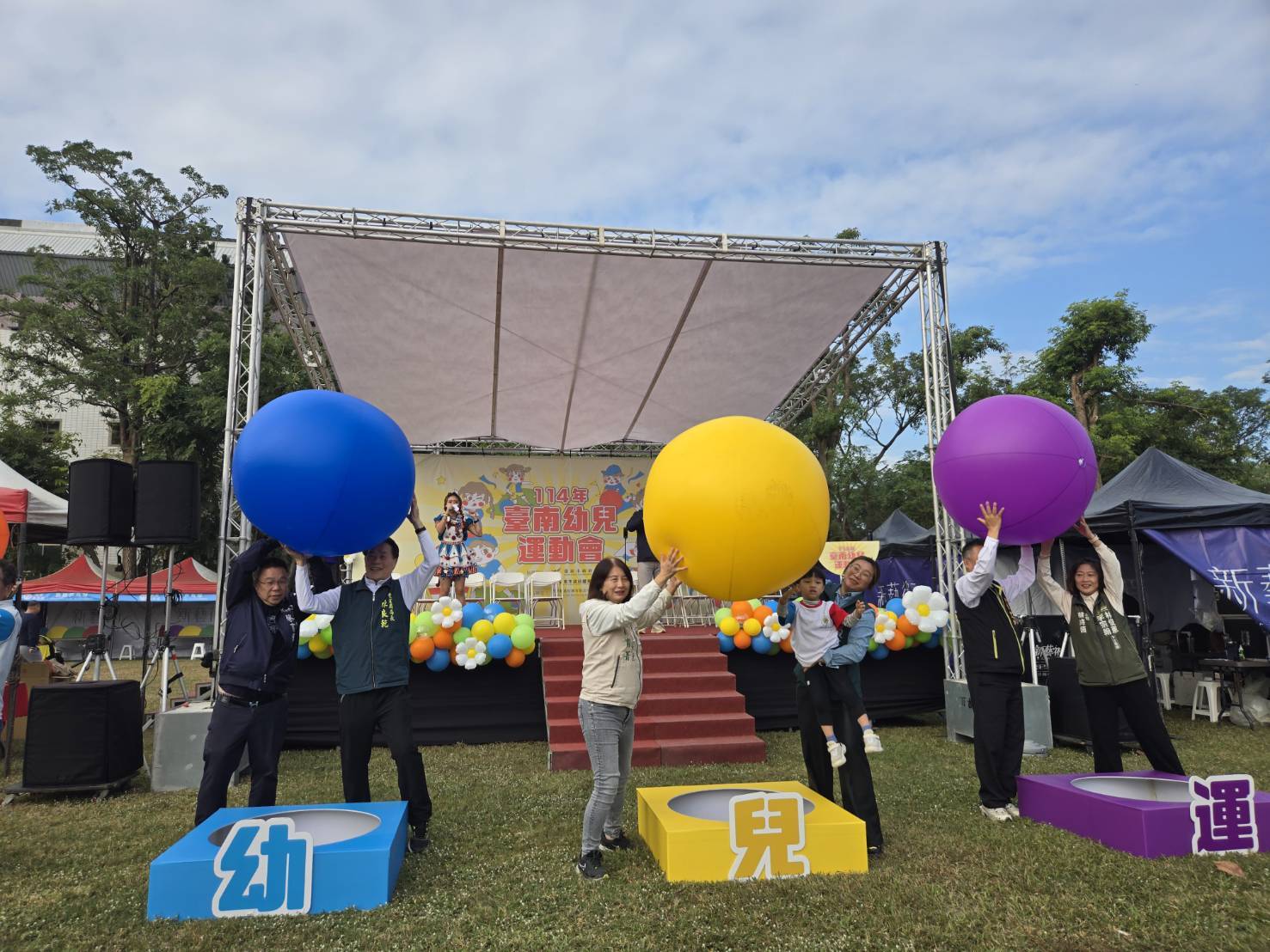 114年臺南幼兒運動會繼11月22日永華場圓滿落幕後,今(29)在新營體育場228公園前草地舉辦第二場,本場次共有58隊、785位幼兒、家長齊聚1,800人一起運動同樂。市長夫人劉育菁代表市長黃偉哲出席活動向現場親子朋友致意,蔡育輝議員、沈家鳯議員、賴惠員立委秘書徐鈺翎、林俊憲立委特助莊淑娟、陳亭妃立委秘書何國禎、王宣貿議員秘書林麗蓉、李宗翰議員蔡詩茵主任、新營區長陳宏田等共同出席「大球傳遞」開幕儀式,祝福每位小小運動員都能享受比賽的樂趣。