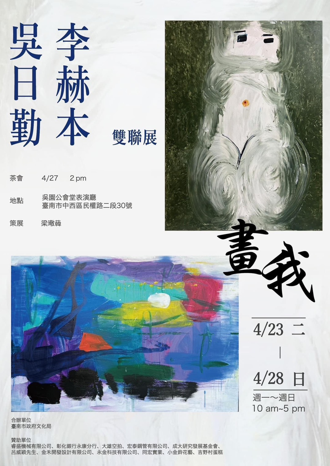 以哲學性的思考[畫我]為主題描摹出[別人眼中的我不是我,我眼中的別人才是我…….。] 藝術家吳日勤、李赫本與臺南市政府文化局於4月23日至4月28日假吳園藝文中心臺南公會堂表演廳共同舉辦[畫我-吳日勤.李赫本雙聯展]並於4月27日下午2時舉辦精彩的藝術導覽會,特別邀請暢銷書作家正觀藝術顧問林丁禾老師主講。