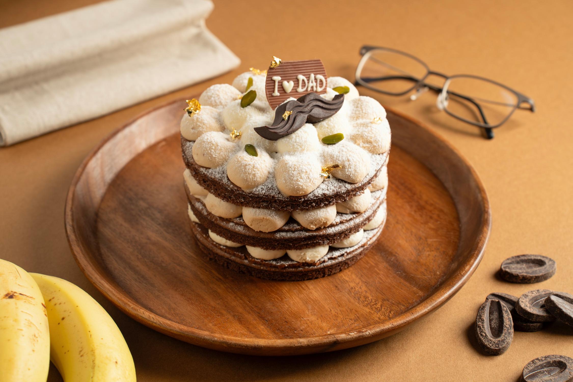 「翹鬍子爹地」– 5吋榛果香蕉巧克力蛋糕,優惠價693元(原價788元):以巧克力裸蛋糕為主體,榛果香緹、香蕉香緹層層堆疊,果香與奶香交織,夾入新鮮香蕉,採用高級食材搭配清爽滋味,再以巧克力做出俏皮可愛的鬍子點綴,表達對爸爸滿滿的真摯情意。