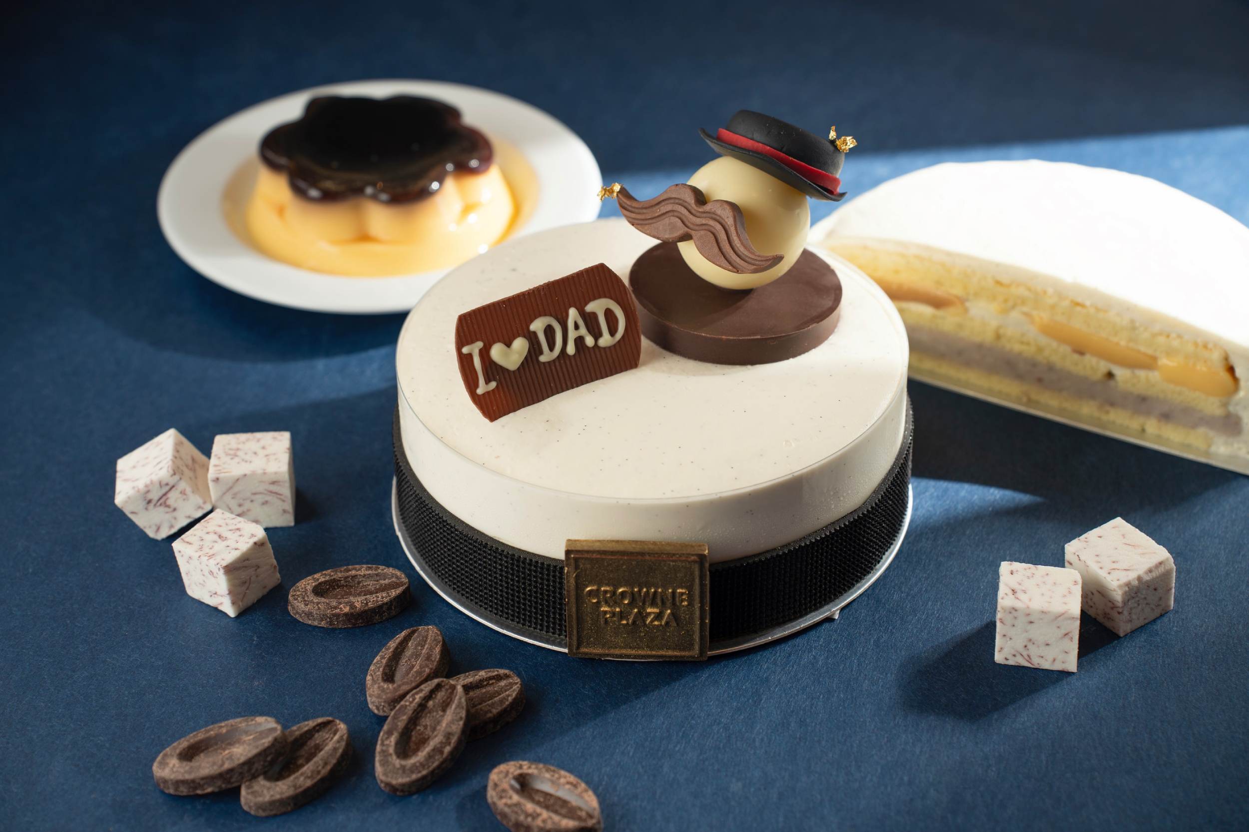 「紳士的帽」– 6吋芋泥布丁香草蛋糕,優惠價781元(原價888元):香草蛋糕體夾入濃郁綿密芋泥餡、雞蛋布丁與香草香緹,詮釋含蓄卻又深奧的經典口味,正如父愛一樣內斂厚實,加上手作巧克力 LOGO 腰帶及帽子造型,整體造型相當討喜。