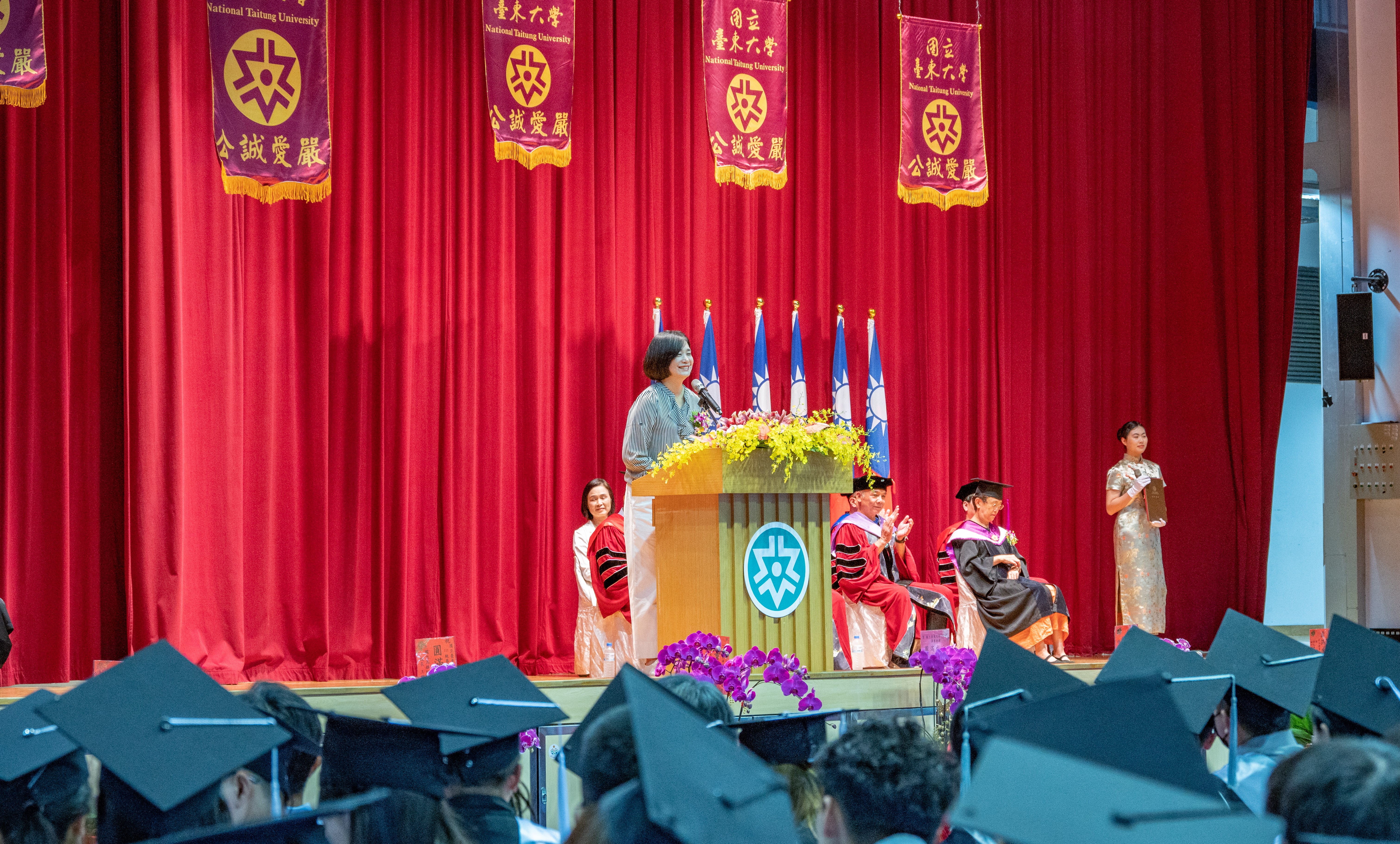 典禮特地邀請臺東縣饒慶鈴縣長、以及高齡92歲的臺東大學傑出校友王任生名譽博士為畢業生祝福勉勵。饒縣長以各自安好祝福所有畢業生在屬於自己的道路上,快樂前行;王任生總裁雖已年至耄耋,但是仍然精神抖擻,聲音洪亮,他以〈不是成功了才有意義,努力的過程才是最大的意義〉勉勵年輕的學弟妹們,「用勇氣和智慧面對挑戰,用真誠和善良鑄就友誼,用堅韌和堅持書寫出屬於自己的精彩人生。」王總裁在典禮中,特別頒發「畢業生熱心服務獎」給18位優秀同學,肯定其在學習態度、學術研究、國內外競賽、社團領導以及志工服務等領域中的卓越表現;這些優秀學子代表臺東大學培育卓越人才的成果,身為與會師長和家長均同感驕傲與欣慰。