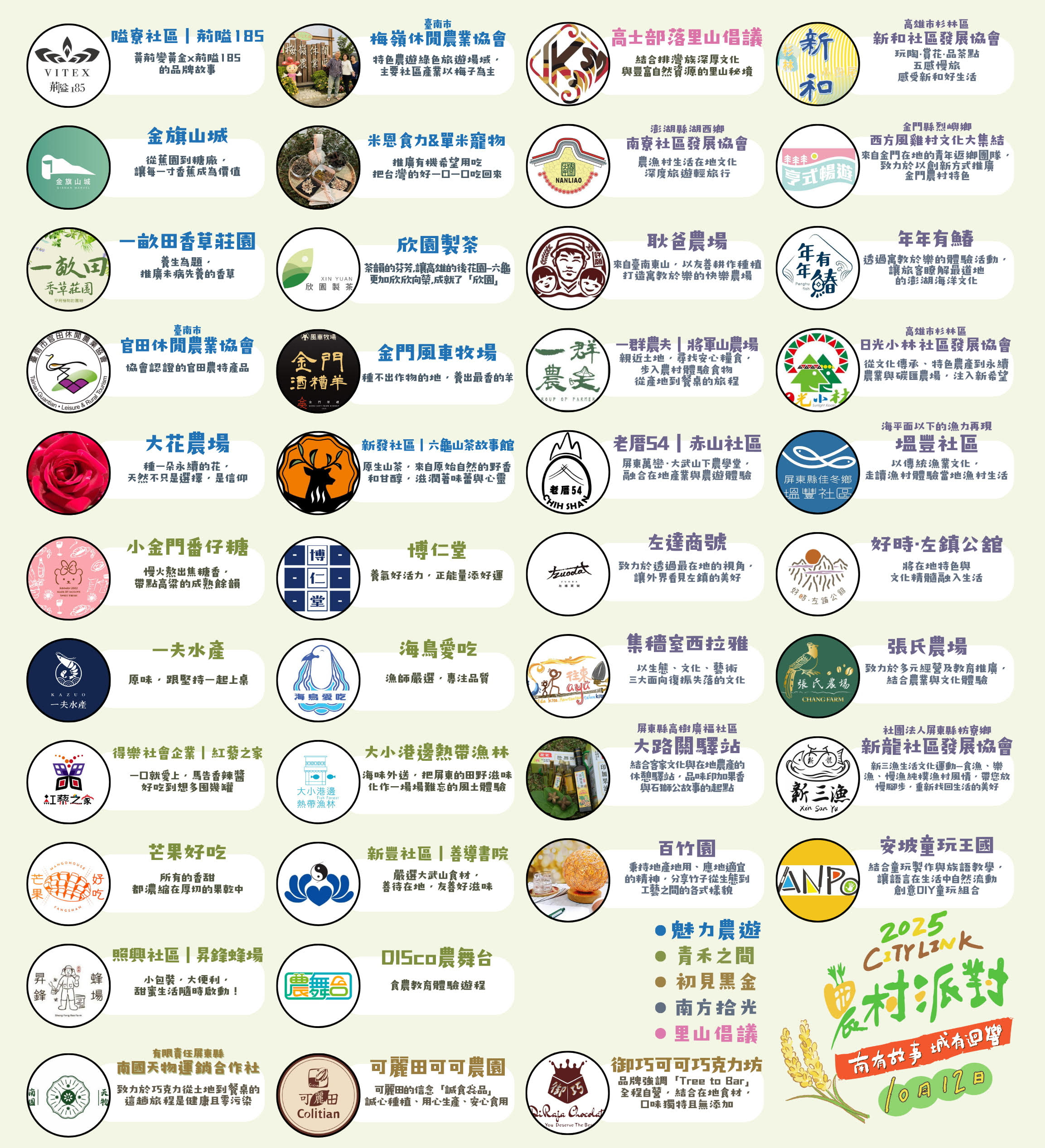農業部農村發展及水土保持署臺南分署主辦「2025 City Link農村派對」農村生活文化市集,10月12日(星期日)上午11時至晚間7時於臺北市客家文化主題公園登場,超過40個南臺灣特色物產及文化相關產品攤位,本次市集也推出消費滿300元換取50元折價券限量優惠,活動免費入場,適合攜家帶眷前往體驗,邀請民眾踴躍參加。
