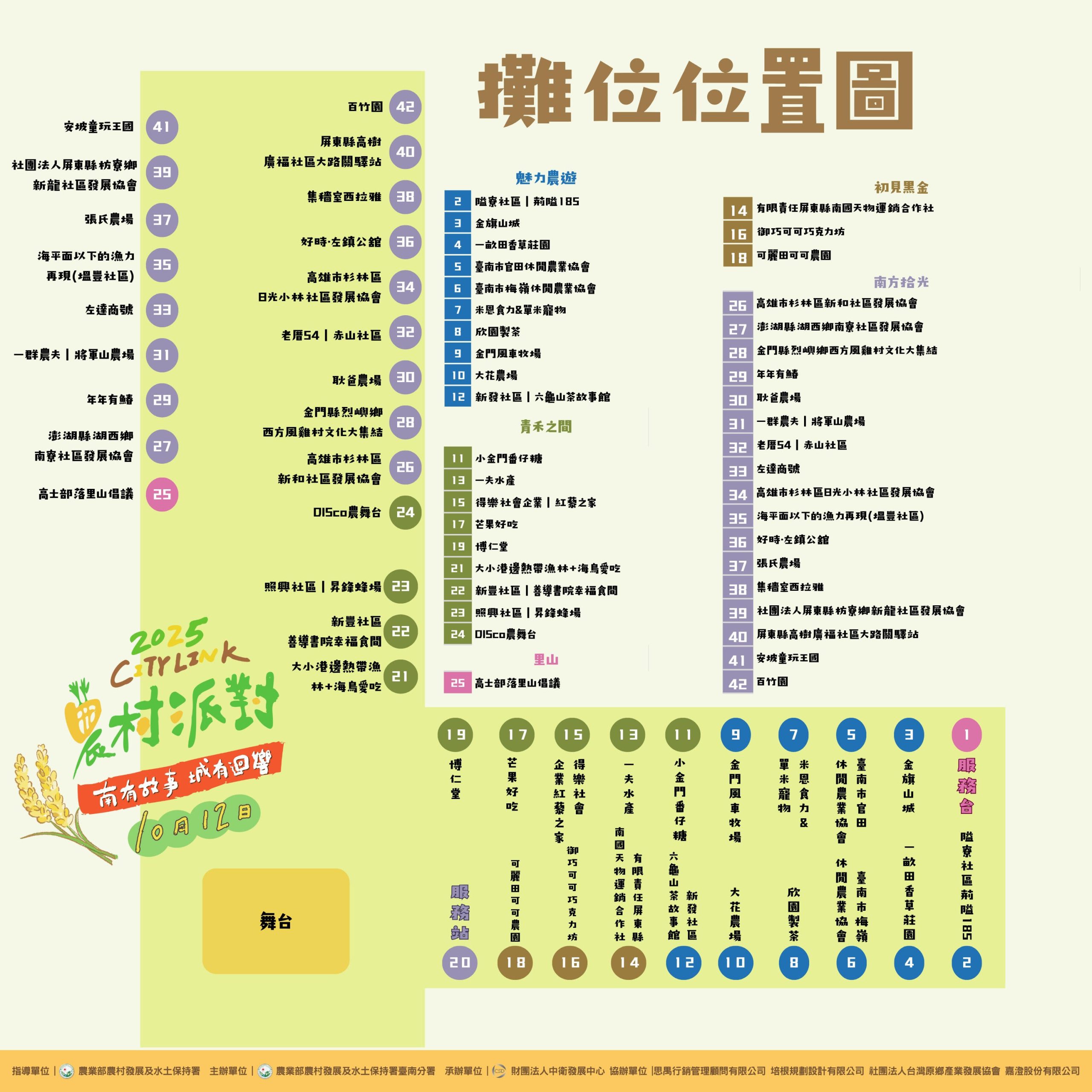 活動以「南有故事,城有迴響」為主題,邀集來自臺南、高雄、屏東、澎湖、金門40組的農村團體,帶來極具特色的文化及好物販售,匯聚在地農產、手作工藝、常民技藝與鄉土飲食,展現生產的多元樣貌與生活的真實溫度,期望讓南方土地的智慧、情感與價值,在城市中被看見、被聽見。現場規劃七大分區,分別為「魅力農遊」、「南方拾光」、「初見黑金」、「青禾之間」、「好客埕席」、「農藝DIY」、「成果展示區」,每一分區都有相對應的主題成果及商品好物,蘊含著農村夥伴的生活與熱情。