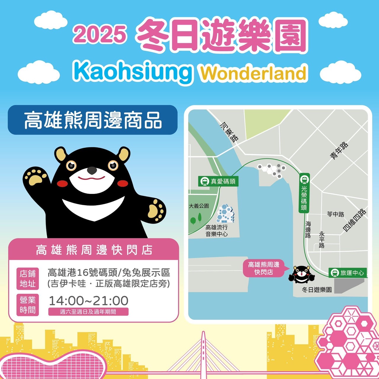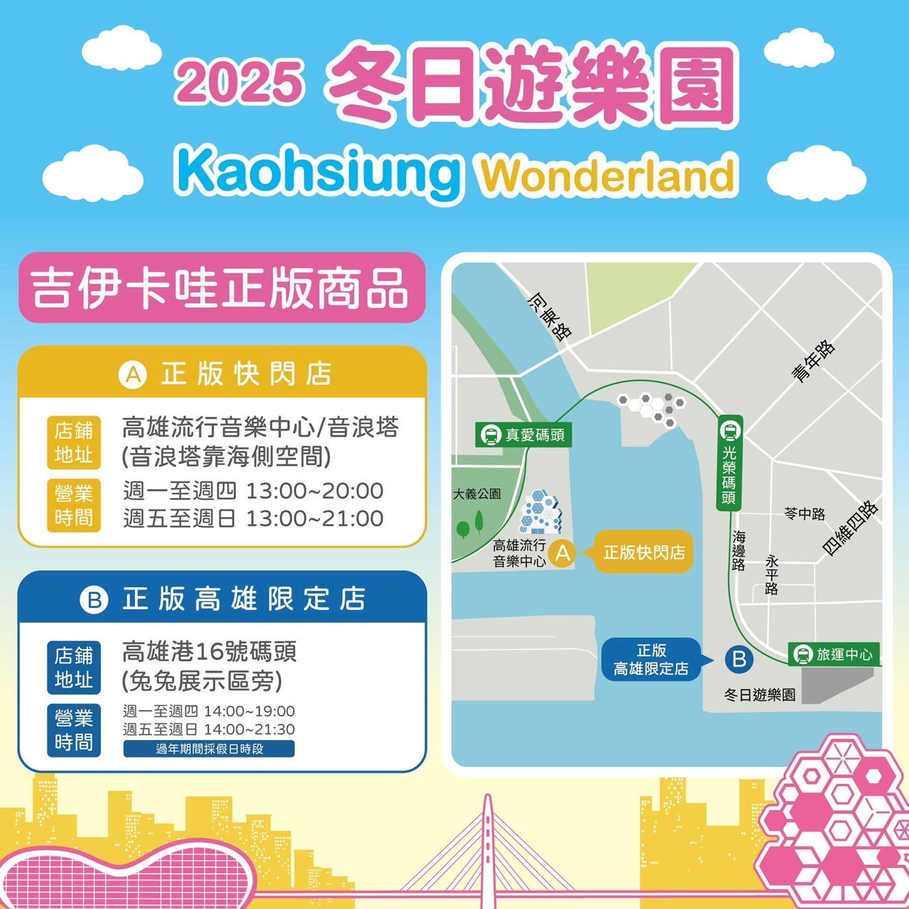 「2025 Kaohsiung Wonderland 冬日遊樂園」1/25至2/16舉行,在愛河灣規劃「吉伊卡哇」主展區,並於16-17號碼頭設置共計25座遊樂設施,免費提供兒童遊玩。碼頭樂園設施開放時間為下午3點至6點,週五至週日及年假期間,增加下午6點至晚上9點時段,遊園券於當日活動開始前1小時,於活動現場發放。活動期間,還有市集美食及精彩親子互動演出,絕對讓大人小朋友玩到不想回家。觀光局也呼籲民眾尊重著作權,本次活動現場有2間「吉伊卡哇」(Chiikawa)正版授權商店;一處在高流音浪塔一樓的「吉伊卡哇快閃店」,而高雄限定的吉伊卡哇商品「高雄限定店」及高雄熊周邊商品則在高雄港16號碼頭(兔兔展示區旁),歡迎民眾前來參觀選購。