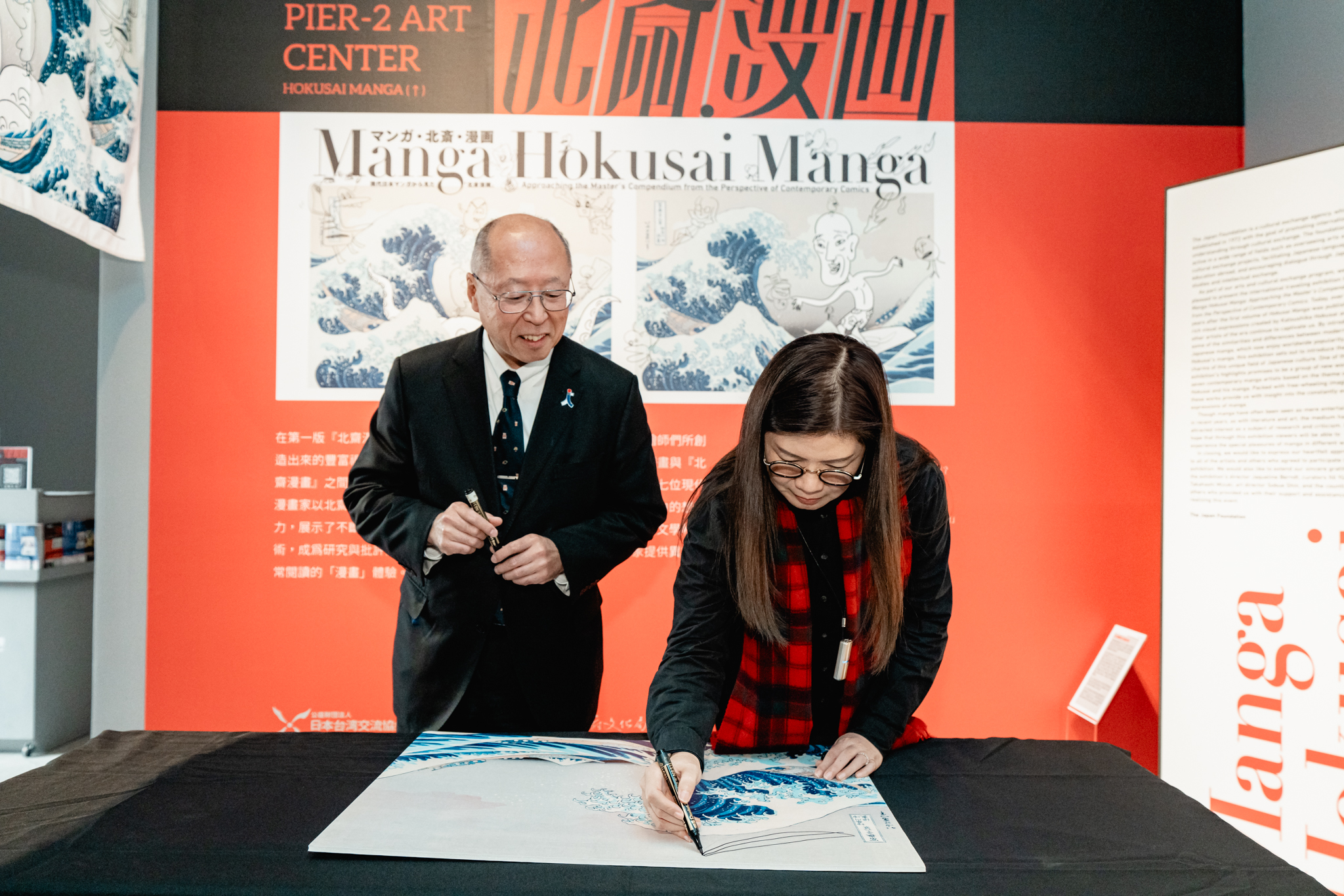 高雄市政府文化局長王文翠與日本台灣交流協會高雄事務所所長奧正史,今日共同為展覽揭開序幕,雙方在這次作為主視覺的「神奈川沖浪裏」畫作上簽名,王文翠更在浪上畫上舢舨船向葛飾北齋致敬,讓台灣早期近海使用的船筏,也能搭上葛飾北齋捲起的世界浪潮,以動漫展覽的交流促進台日雙方的文化交流互動。