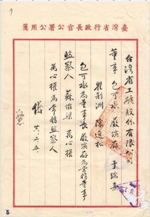 陳逸松很會奉承,1946年8月他參加「台灣光復致敬團」去南京向蔣介石感恩致敬,他們並捐贈政府五千萬法幣,而且特別飛到西安祭拜黃帝陵。9月陳逸松當選國民參政會參政員,這是當年最高的民意代表,可以向南京國民政府提建議,儼然是一位台灣的政壇紅人。1947年2月5日,台灣省行政長官陳儀更親筆提名陳逸松等五人擔任台灣省工礦公司董事,陳逸松是該公司董監事中唯一台灣籍者,足見陳逸松是陳儀少數信任的台灣人之一。〔見下圖〕。