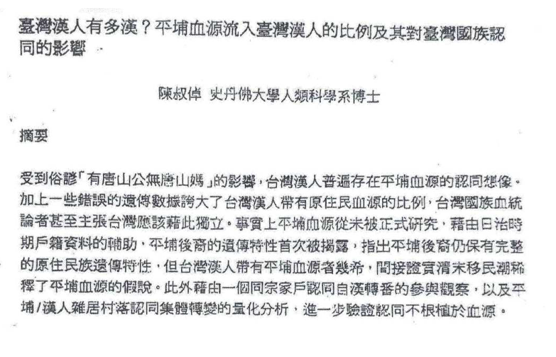 En 2008, le Dr Lin est tombée sur un article co-écrit par Chen Shu-chuo, publié sous l’égide du département d’anthropologie de l’Université Fudan en Chine. L’article, intitulé Taiwan Indigenous Peoples and Patrilineal Relationships with the Dai Ethnic Group in China (BMC Evolutionary Biology, 2008, 8:146), rapportait l’analyse d’échantillons d’ADN de 220 individus autochtones taïwanais à l’Université Fudan, à Shanghai. Ces échantillons couvraient plusieurs groupes autochtones, notamment :