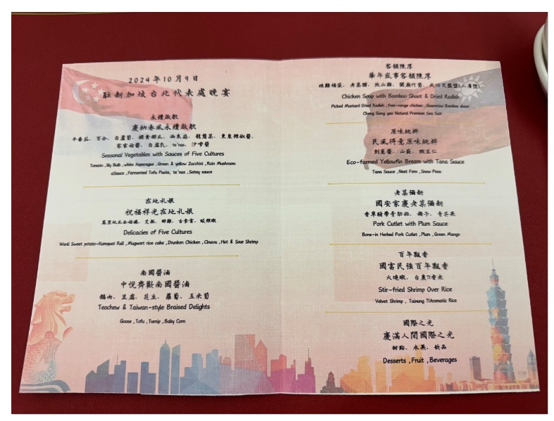 楊總監與陳教授親自設計與印製這兩天官邸菜單,並攜來今年五月的國宴說明書、天后宮的聖母安瀾紀念品、台南的「茶の魔手」的奶茶及台東鹿野的允芳茶王精品茶,並由他們親自佈置餐桌與擺飾,甚至還親自為新加坡貴賓上菜與解說每一道菜色,讓所有與會賓客充分感受到台灣國宴氛圍與熱情。