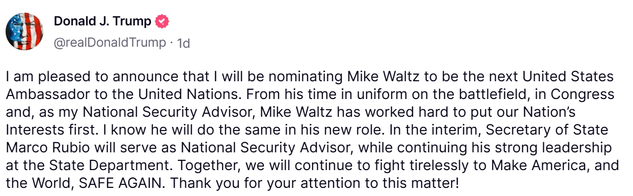 沃爾茨離職後,盧比歐臨時接任國家安全顧問,同時保留國務卿職務,並於2月整合美國國際開發署(USAID)。根據《GZERO Media》,盧比歐成為繼季辛吉(Henry Kissinger)後,首位同時兼任國務卿與國安顧問的官員。這一安排顯示川普對盧比歐的信任,但也引發外界對其負擔過重的質疑。