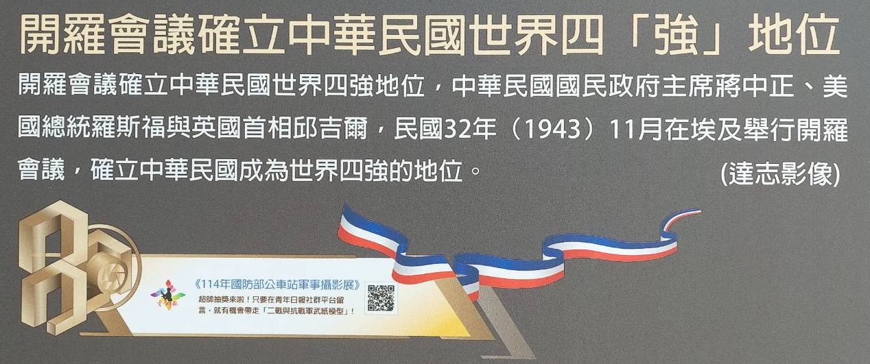 因此在815終戰八十週年紀念日當下,令人匪夷所思的高雄市,作為台灣民主聖地的淨土,居然在公車站亭看板展示蔣介石參加《開羅宣言》這一歷史照片,企圖繼續洗腦台灣人。看板的左下方小方塊文字說明這幅照片的意義(如下圖),並有《114年國防部公車站軍事攝影展》字樣。