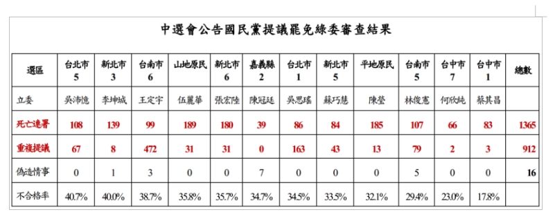 2月27日暨3月2日中選會公告通過第一階段罷免案。其中32件藍委罷免案悉數通過審查;但在國民黨主席「以罷制罷」的號召和支持下,除了先前傳出好幾件「抄名單」假連署被抓包之外,其所提出的12件罷綠案全未過關。主因在於不合格率偏高(最高者為罷免吳沛憶的40.7%),而且當中還查出隱藏「1365名亡者」連署。