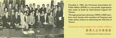 1982年2月14日,彭明敏、蔡同榮、王桂榮、陳唐山等人,在美國洛杉磯成立福爾摩沙人公共事務會(FAPA/Formosan Association for Public Affairs),蔡同榮擔任首任會長。FAPA以促進國際關注台灣、推動台灣建國為宗旨,總會設於華盛頓特區,在全美有43個分會。台美人出錢出力,無非就是期望台灣經由自決,早日成為民主自由獨立的國家。 (圖:FAPA)