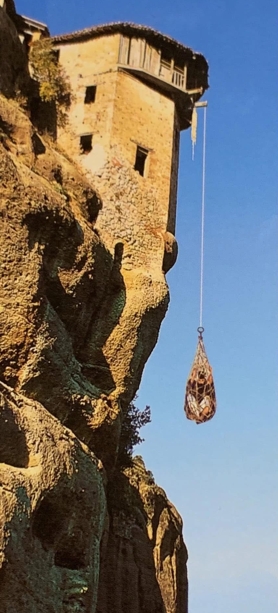 修道院的古壁畫中(如最下一圖)有一幅最聳人聽聞的是,有一只專為修士冥想靈修的網狀懸掛編織物。靈修的修士被裝入網𥚃,懸空吊掛山壁邊。