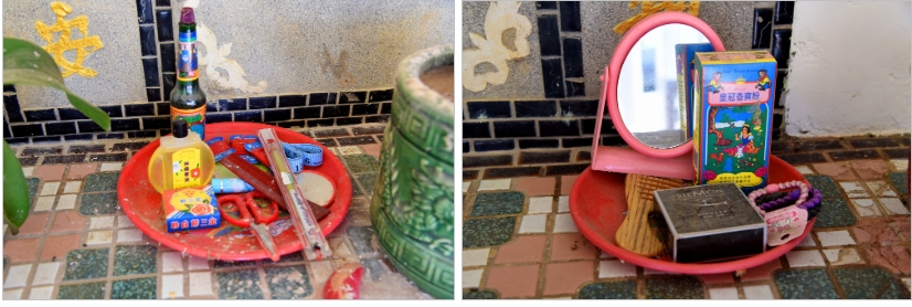 頂下桌為磚砌黏瓷磚一體建構。頂桌中置瓷香爐,兩旁各置胭脂水粉、油燈及蘭花盆栽,前置茶杯3只。下桌擺有飲料、糖果等供品。頂下桌正立面,以黑色瓷磚黏砌成桌面及桌腳,造型古拙、醒目,甚有創意。
