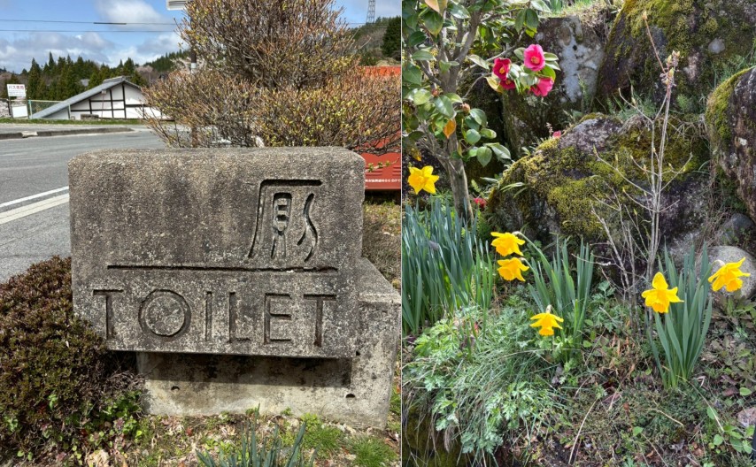 古樸沉重的「便所」告示碑,對上生氣盎然的黃色鳶尾、粉紅茶花及石頭上的青苔,就是我們漫步的起始點。
