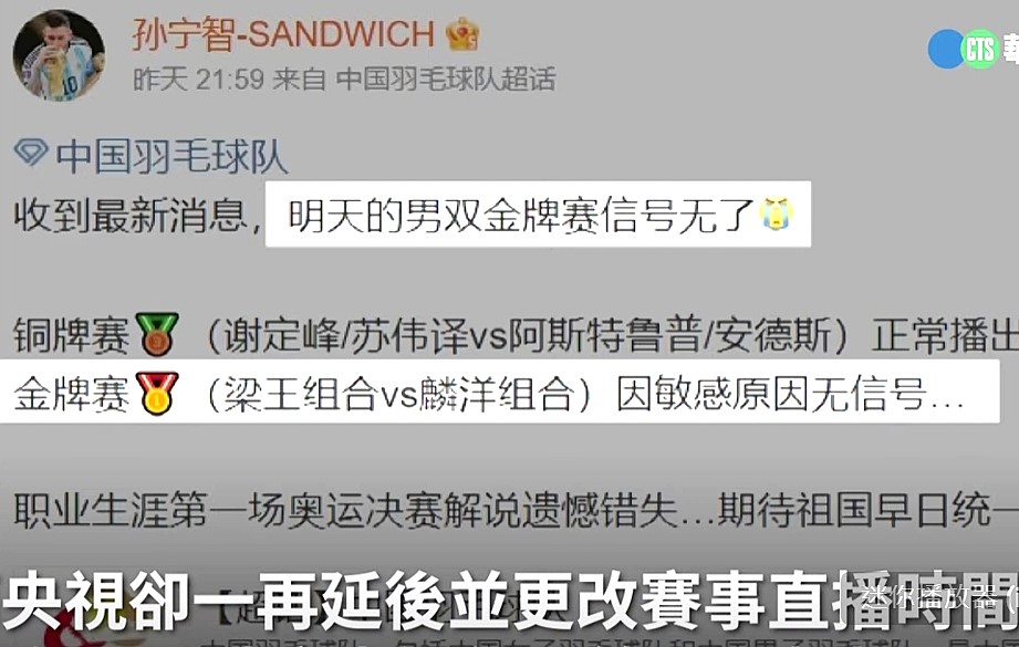 八月四日晚間的奧運男雙羽球,台灣選手李洋和王齊麟再度拿下金牌,對手是中國隊CHINA,雖然台灣選手的衣服上寫著CHINESE TAIPEI,不知情者以為是兩個中國在對打。正當台灣的觀眾開開心心看球賽為台灣隊加油,想看哪一台就轉哪一台之際,中國觀眾可就沒那麼幸運了!中國官媒《央視》繼日前「強行卡掉」麟洋配與中國的小組賽後,在這場金牌賽事時間,又更改為「錄像:體操男子吊環」,令許多中國球迷超崩潰!中國觀眾生氣地說想看自己國家選手打「麟洋」都不行?中國官媒見不得台灣好?