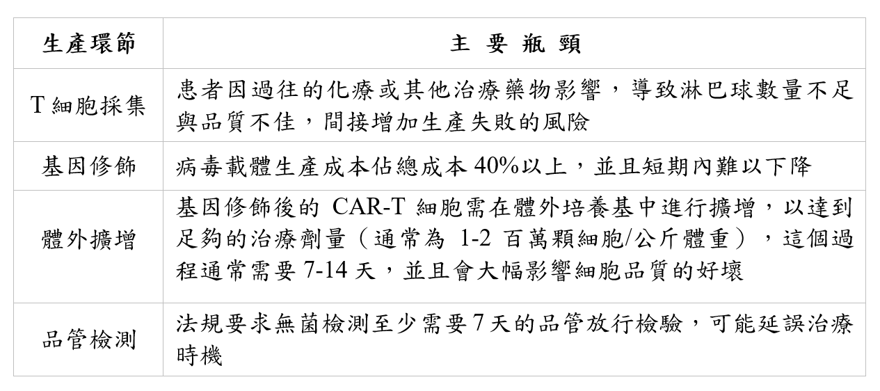 CAR-T細胞屬於高度客製化、個人化的治療,生產流程涉及病人的T細胞採集、基因修飾、體外擴增、及品質管控等多個環節,從病患採血到CAR-T細胞回輸耗時3-6週不等,且生產成本高昂。主要原因是生產過程需符合嚴格GMP規範,導致全球僅少數具備先進細胞培養設施的藥廠或生技公司能規模化生產。如表一所示,現有CAR-T生產模式存在明顯瓶頸: