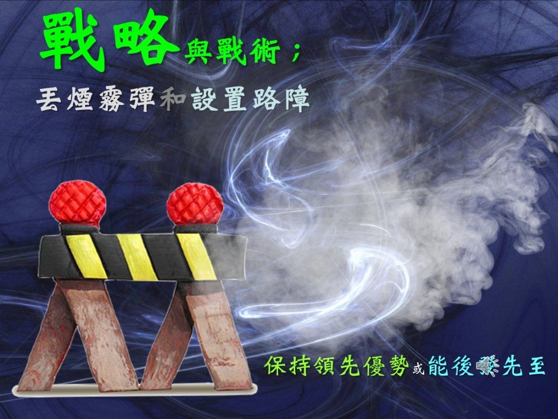 因為戰術是服務戰略的,像丟些煙霧彈迷惑對手,或者設置路障讓別人要跟快你(很困難)。那進來的時候,其實會碰到一些障礙,不容易追上你,這讓你能夠保持領先的優勢,或者能夠後發先至。