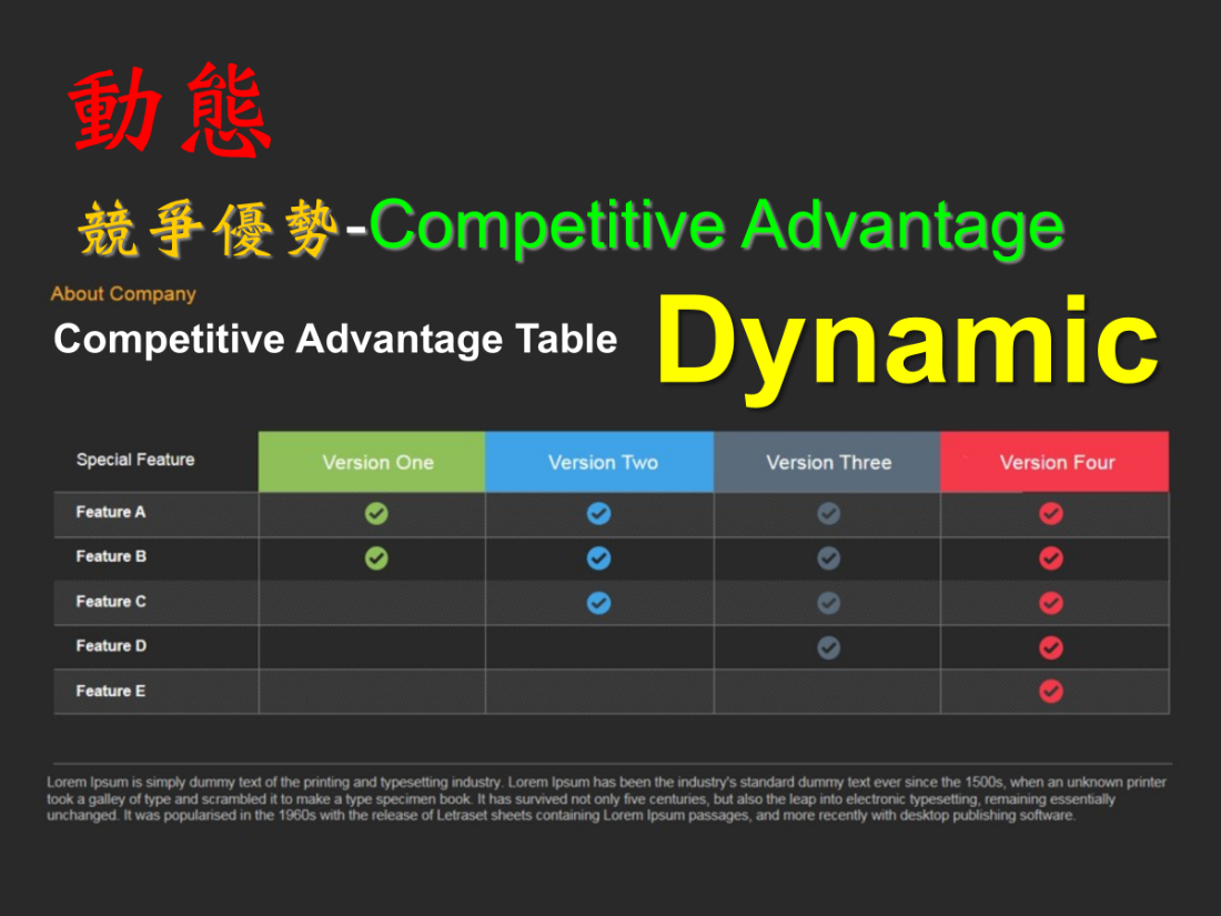 接著我們來談Competitive Advantage競爭優勢,因為整個市場上競爭是非常非常dynamic的非常、非常動態。所以如果你能夠在動態中取得優勢,就代表你有了時間的領先性,你建立一些障礙,別人要跨越你並不容易,所以你的成功機率會比別人來得更高。