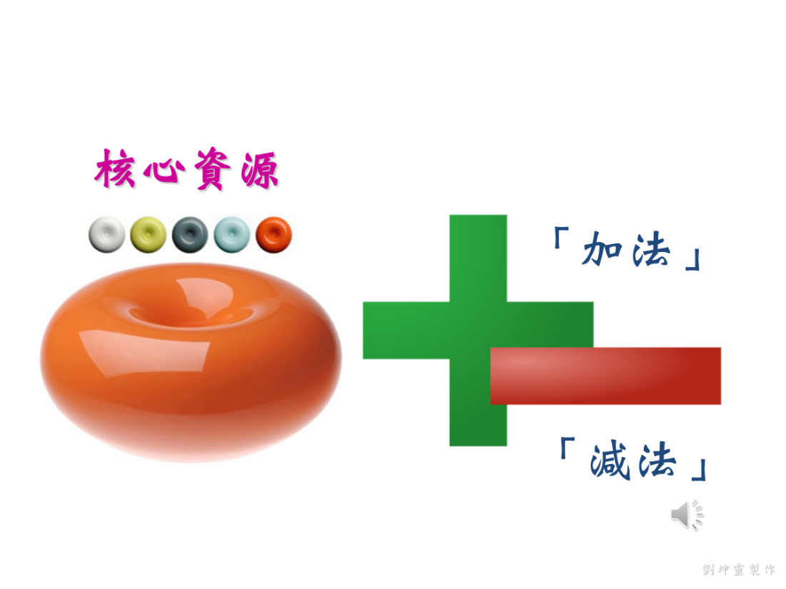所以,你的資源永遠是有限的,那麼你必須專注在你的《核心資源》!那在你的核心資源上呢?做兩個事情,在純粹的核心真正的核心上面做《加法》,而非核心的部分,非核心資源部分做《減法》!