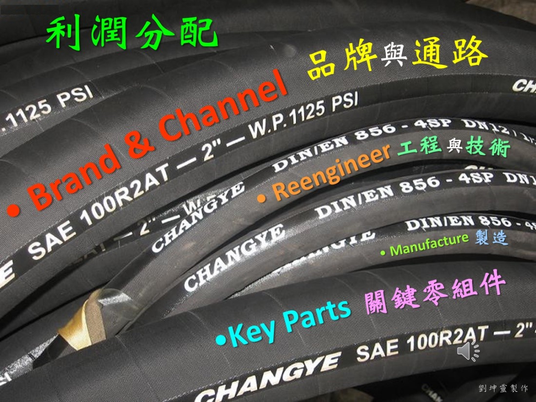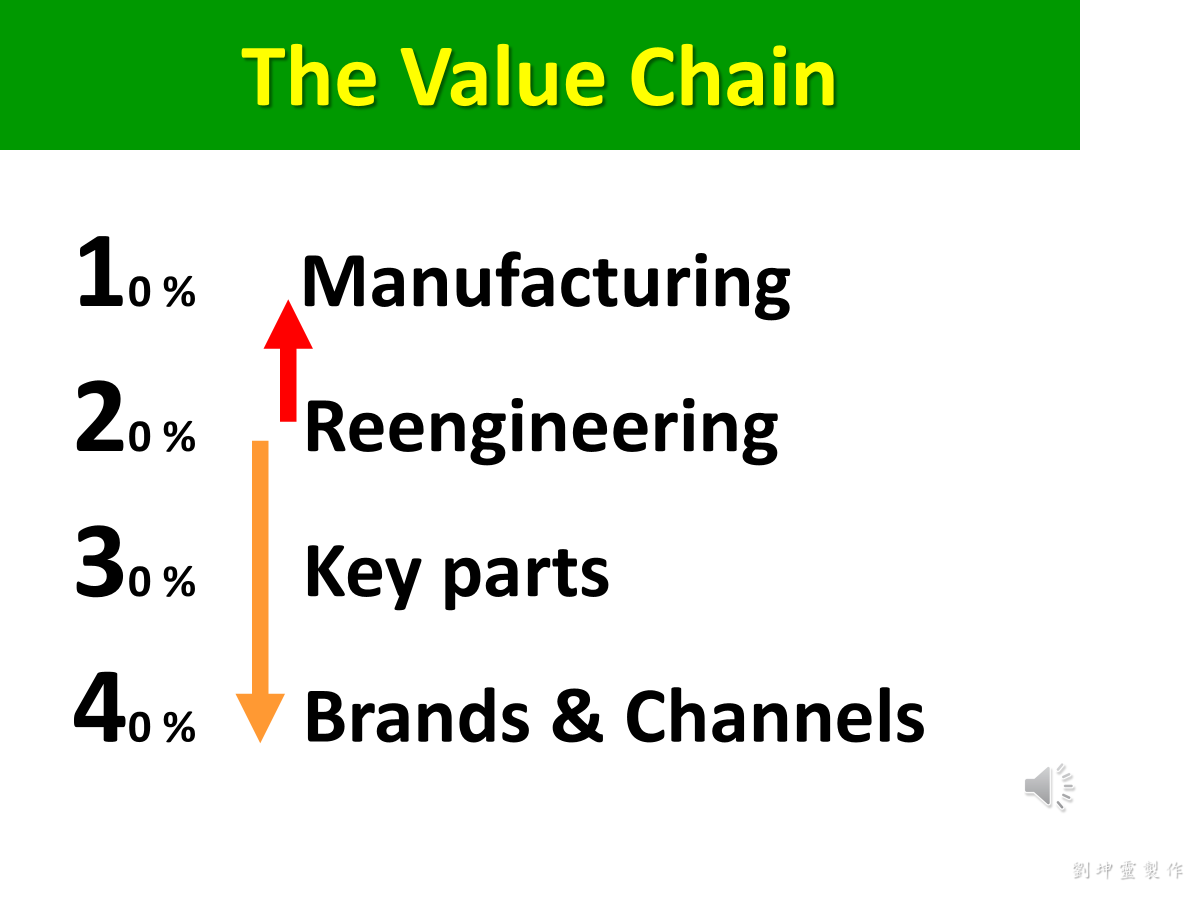 各位可以看到在這一頁裡頭,我從製造、工程、關鍵零組件到品牌(及)通路(排序),基本上是越來越大,這個是有意義的。在下一頁的說明,你會更瞭解這些內容!