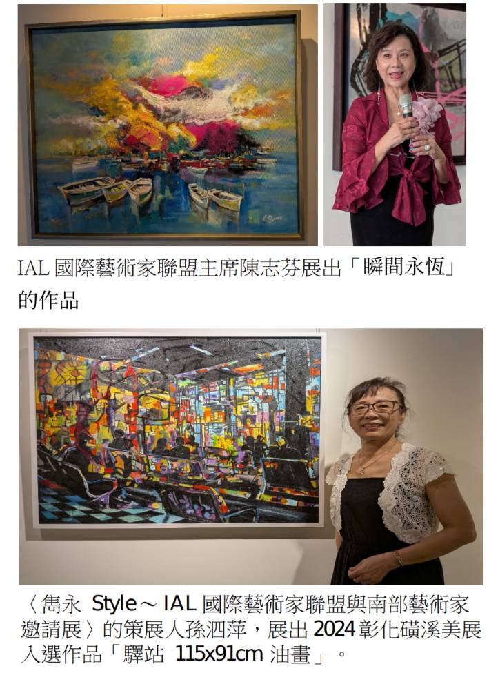 〈雋永 Style~IAL國際藝術家聯盟與南部藝術家邀請展〉,8月16日下午開幕,高雄市文化中心至高館,藝術界南北群英匯聚,現場肅嚴語句析論、鬆柔氣氛交流,各據一隅。應邀出席的文化中心處長廖小玲表示,高市近80個藝術團體,她環顧一下應有八成理事長出席。香榭藝廊總監陳文龍表達高雄人熱情,歡迎各地藝術人到高雄藝術交流。