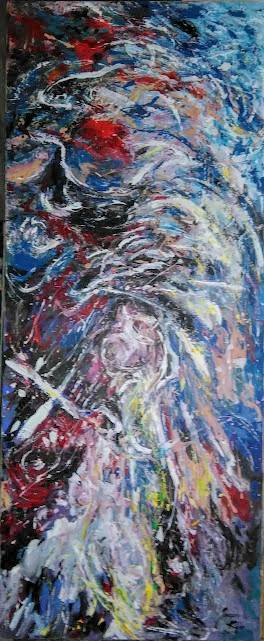 抽象畫用墨黑、紫藍背景,輕柔舒暢隨性所至地讓白色顏彩,在天地引吭高歌,在人世間翩翩起舞。此畫在「 鵲夢鳳,昇華」的眾神加持之下,輝煌登場。