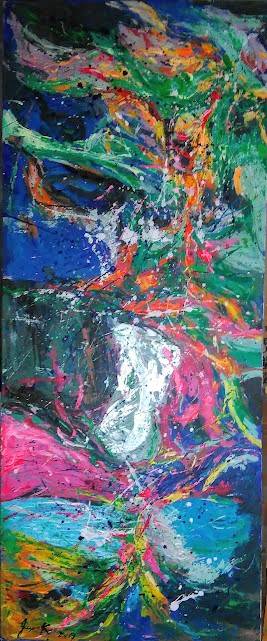 抽象畫最能描繪「 痛楚」的感覺,何況這還是肉身蛻變,靈魂出竅的戲碼呢!這一張淋漓盡致的長幅油畫,隱約有鳥禽類的振翅飛舞、翻轉跳躍的形象,雖無科幻電影的數位動畫誇張與華麗,卻有傳統手繪圖的真摯溫暖感覺,情緒飽滿,絕不濫情。