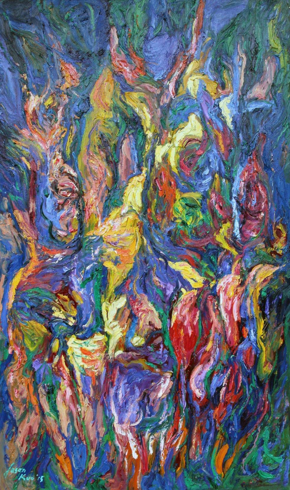 無庸置疑,這是低落情緒的反彈,一種寫詩療傷、繪畫救贖的藝術家寫照。看看抽象畫:一簇簇的向上造型,有如花苞,引頸期盼,有如火苗,熱烈蒸騰,更像地獄中的痛苦靈魂,伸出雙手,向上祈求救贖。