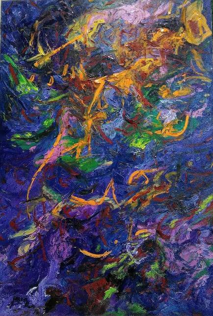 抽象畫鮮明的橘紅色線條,彷彿指揮棒一般,從右上劈向左下,拉出鮮明的主旋律,間或穿插紅綠的顫動音符,陪襯朦朧的藍紫低音合奏……讓畫面充滿律動的節奏,緩緩推動第二、第三主旋律,然後在裊裊的粉紅色,紛紛的淺綠色合奏之中,華麗收尾,完成一場聽覺與視覺的饗宴。