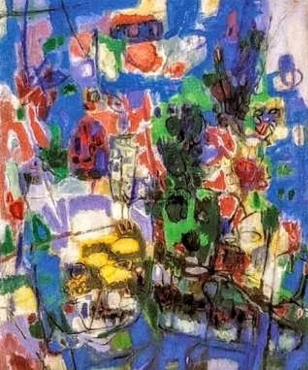 再直接由畫面切入,觀者會有一股「色彩風暴」直覺:藍、綠、紅、黃與白彼此衝撞、重疊、滲透,形成一種既和諧又不安定的張力。藍色是主要的背景基調,像是天空、海洋或一種深沉的精神場域,把其他色彩都納入其中;而綠色與紅色則像植物與動物血肉,帶來生命的律動與激情。請特別留意,那黃色分布在畫面下方與中央偏左的位置,形成視覺焦點,如同陽光在混沌的世界裡突兀閃現。