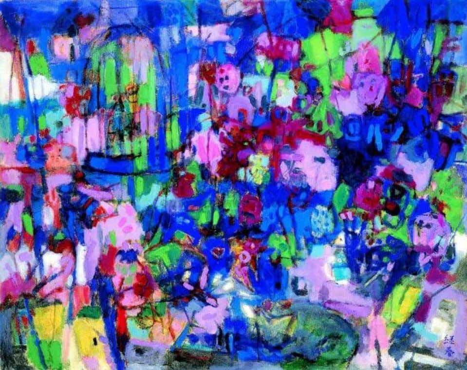 當我們面對《花園春景》,最直覺的感受就是「眼花繚亂」— 色彩繁密、形象交疊,難以一眼看清楚名堂。然而,當視線逐漸適應,便可發現畫面的節奏感:藍色的冷靜調和了紅與粉的躁動、綠色的清亮舒緩了紫色的濃烈,最終形成一種和諧卻不失張力的視覺交響。