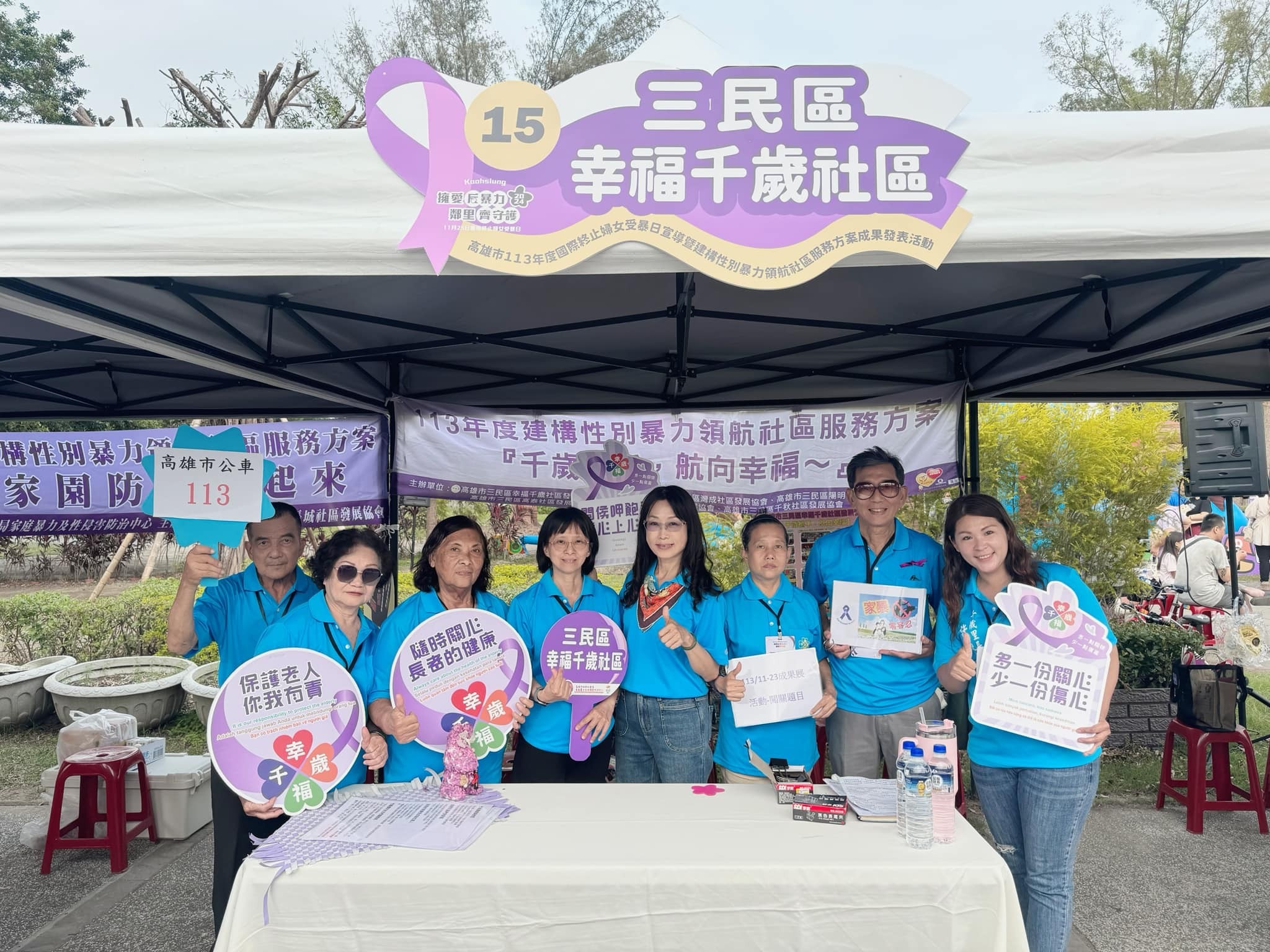 幸福千歲社區自109年起參與防暴宣導,從擔任實作社區學習推動防暴工作,並於111年起獨立執行宣導計畫,113年起更肩負領航角色,帶領三民區6個社區一同推動暴力預防活動。社區充分運用鄰近商圈、超商、診所等在地特色,結合商家與志工團隊力量,主動向居民傳達防暴正確觀念、設置安心據點提供民眾防暴資訊與協助,並透過節慶活動及各種宣導場合,運用設攤、桌遊、踩街等互動體驗方式,潛移默化地將性別平等與暴力預防觀念深植人心。