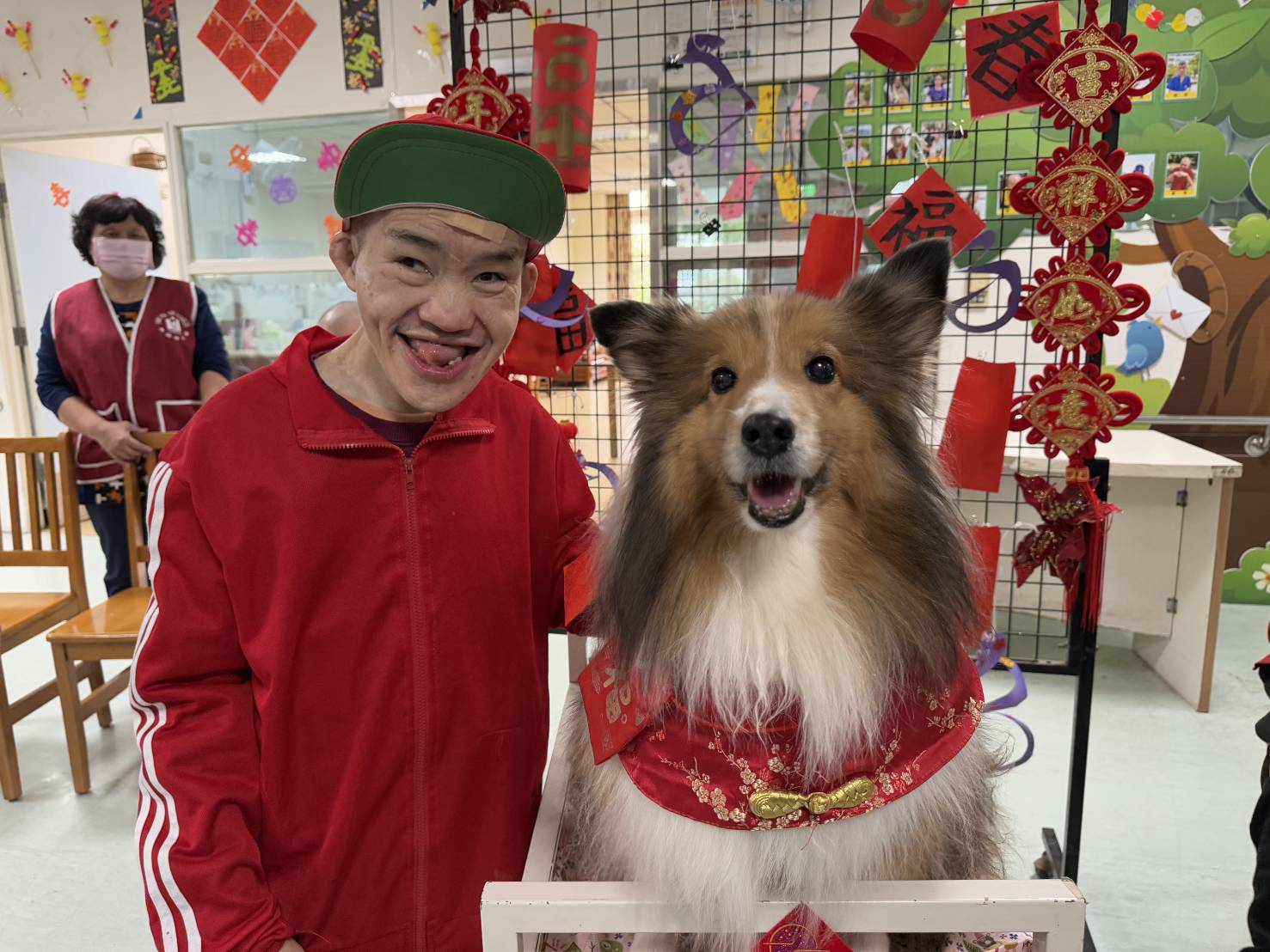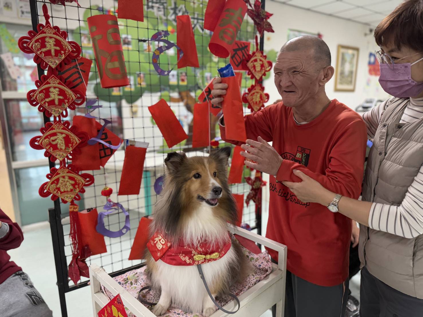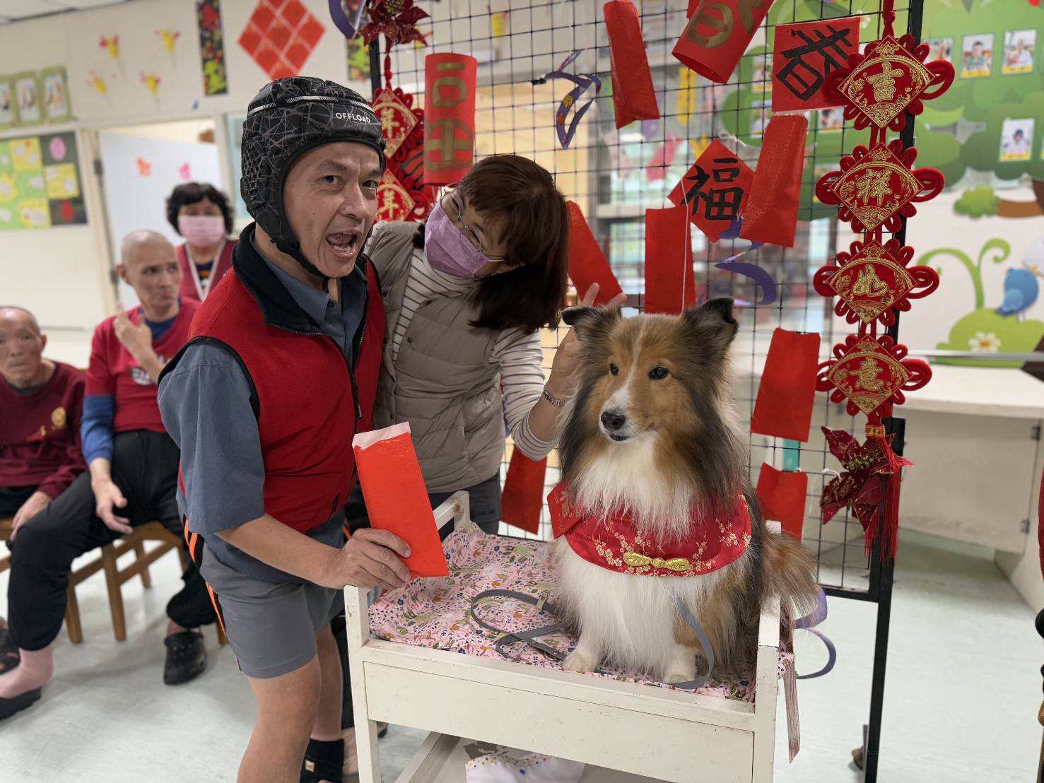 58歲重度心智障礙者阿民,牽著丹丹一起抽個大紅包,憨兒阿民既開心又認真,一次一次努力嘗試舉高輕微攣縮的左手,透過教保人員協助阿民,一起推著丹丹乘坐的福氣專車到紅包牆前,興奮地挑選吉祥紅包。53歲極重度心智障礙者阿文,坐在輪椅上充滿期待的眼神,暖心的丹丹狗醫生,耐心停留在輪椅邊,等候阿文輕輕將身體慢慢往前傾靠,依偎丹丹背上柔軟被毛,滿足感受暖暖的溫度,阿文舒緩了情緒,也能完成伸展上半身的復健運動。