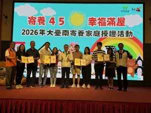 臺南市為感謝寄養家庭對於寄養兒少的照顧,今(18)日社會局與北、南台南家扶中心舉辦「『寄養45幸福滿屋』2026年臺南市寄養家庭授證活動」,由社會局葉誌明副局長代表黃偉哲市長頒發81戶寄養家庭合格證書,並分別表揚屆滿服務30年、20年、15年、10年、5年的寄養家庭共計14戶,肯定其長期對寄養兒少的付出,與市府一同守護兒少未來。